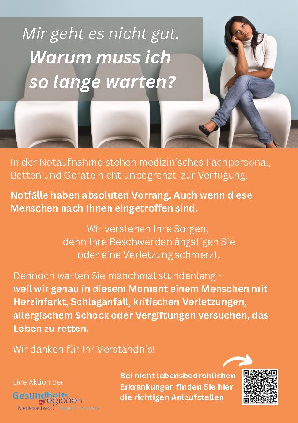 Notaufnahmen sind ausschließlich für echte Notfälle, also sehr schwere, lebensbedrohliche Verletzungen da. Viele Menschen suchen jedoch die Notaufnahme auf oder rufen den Rettungsdienst, ohne dass ihre Lage lebensbedrohlich ist. Die Folge davon sind überfüllte Notaufnahmen und damit fehlende Ressourcen für echte Notfälle, bei denen eine schnelle Hilfe dringend oder sogar überlebenswichtig sein kann. An diesem Punkt setzt die gemeinsame Plakatkampagne der Zentralen Notaufnahmen und der Gesundheitsregion Region Hannover an: Künftig informieren Plakate in allen Notaufnahmen und sensibilisieren so für einen bewussten Umgang mit dem Notruf und Notfallaufnahmen.