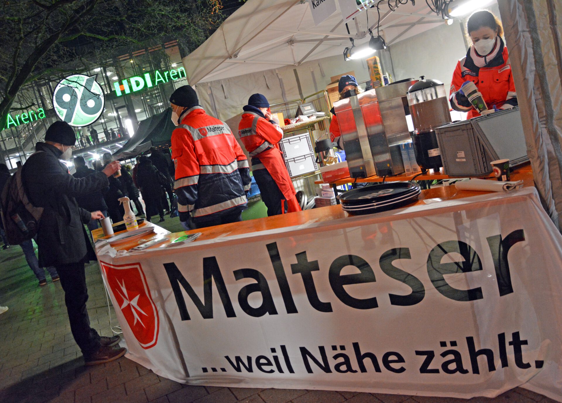 Dafür sorgten nun die Malteser. Seit Wochen hatten Matthias Grote, stellvertretender Stadtbeauftragter der Malteser in Hannover, und weitere Ehrenamtliche diesen Einsatz vorbereitet. Mit 15 Helferinnen und Helfern standen sie am Nachmittag und Abend des 22. Dezember vor der HDI-Arena, um die Menschen in der langen Warteschlange mit heißen Getränken zu versorgen. Das heißt eben auch, nicht nur auf Gäste zu warten, sondern mit einem Tablett und heißem Kaffee zu den Menschen hinzugehen. Rund 2.500 Liter hatten die Malteser schließlich ausgeschenkt, als der letzte Helfer nach Mitternacht gegangen war.