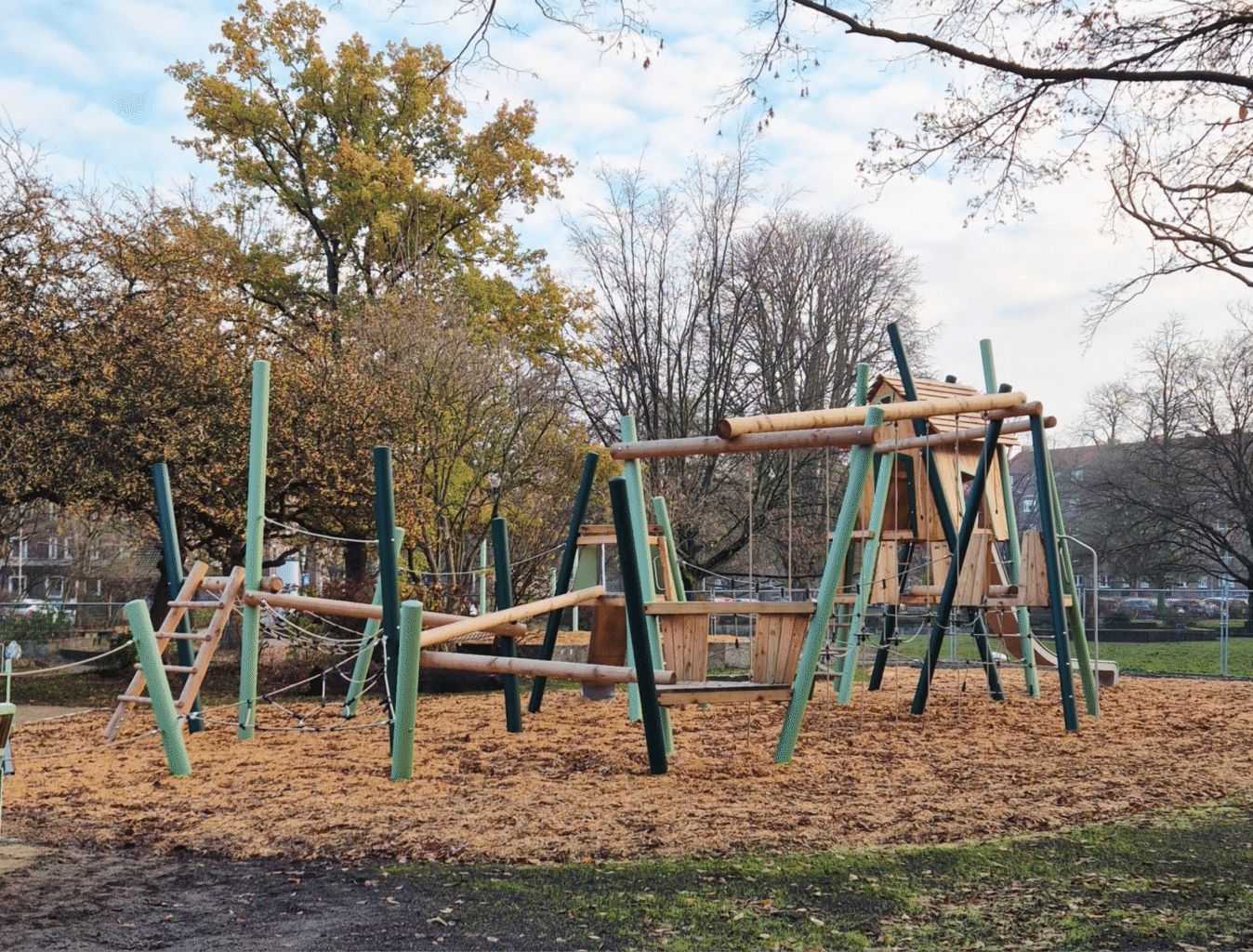 Der neue Spielplatz lädt mit einer großen Baumhaus-Kletterlandschaft zum Entdecken ein. Netze, Seile und zwei Rutschen in unterschiedlichen Höhen sorgen für abwechslungsreichen Spielspaß. Auch der Sandspielbereich wurde komplett barrierefrei angelegt: Ein überdachtes Podest mit Sandkran und Sieb ist für Kinder im Rollstuhl gut zugänglich und ermöglicht gemeinsames Spielen. Das vorhandene Schattendach bleibt erhalten und wird künftig durch eine neu gepflanzte rotblühende Kastanie ergänzt, die an heißen Tagen angenehmen Schatten spendet.