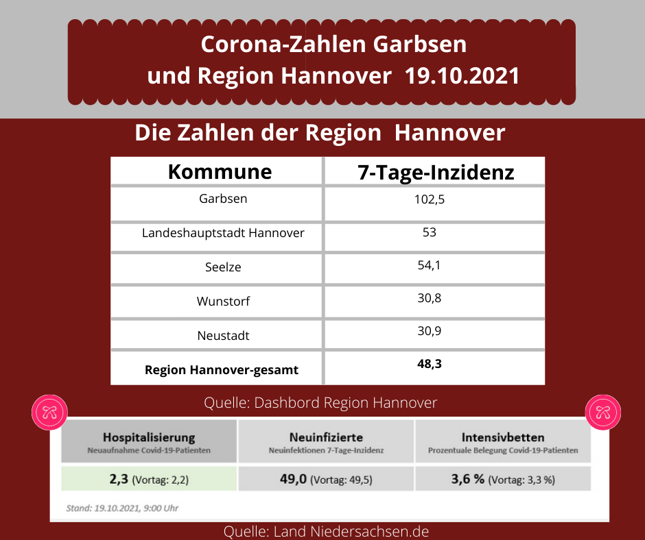Die zur Zeit geltenden Regeln in Garbsen und der gesamten Region Hannover:Für die Corona-Regelungen des Landes sind drei Werte relevant. Der erste Wert, die 7-Tages-Inzidenz pro 100.000 Einwohner, wird vom RKI ermittelt und täglich unter diesem Link veröffentlicht. Die beiden anderen Werte sind Landeswerte für ganz Niedersachsen, gelten auch für die Region Hannover. Sie werden täglich vom Land veröffentlicht unter diesem Link. Um direkt für Garbsen und weitere Städte der Region Hannover die Zahlen einzusehen, klicken Sie bitte auf diesen Link. Hier können Sie Ihre Stadt eingeben und die Zahlen einsehen.
